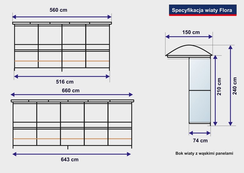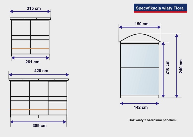 | Konstrukcja: Profile stalowe Dach: Poliwęglan komorowy przyciemniany 4 mm Przeszklenie: Szkło hartowane 6mm Ławki: Sosnowe pokryte lakierobejcą. Kolorystyka: Malowanie wiaty w kolorach zielonym, żółtym, niebieskim i szarym oraz lakierobejca siedzisk kolor tek i piniowy |
