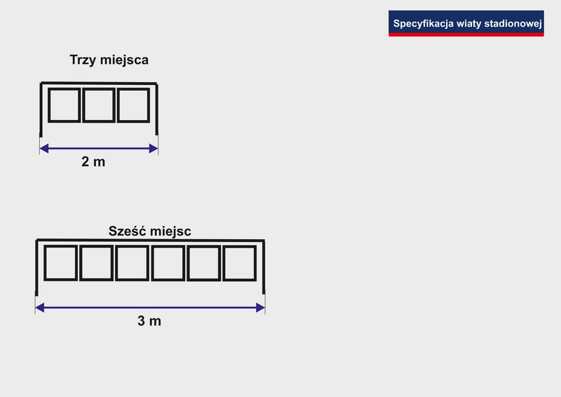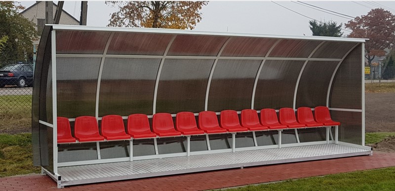 Wiata wyposażona jest w plastikowe siedziska z niskim oparciem.Ponadto wiata może zostać wyposażona w koła umożliwiające swobodne przemieszczanie wiaty, wyższe oparcia siedzisk, dowolny napis na poliwęglanie np Goście,Gospodarze. Ponadto konstrukcja może być wykonana w całości z aluminium. W miarę możliwości technicznych jesteśmy w stanie wykonać wiatę na od 2 do 15 osób.